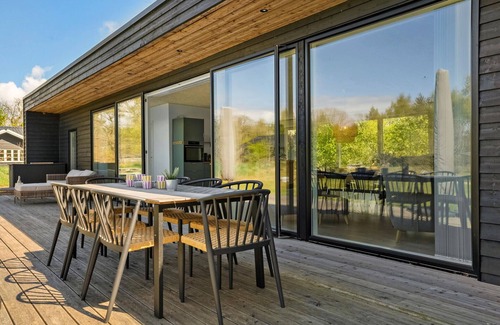 your elegant holiday home invites you to take a break where comfort, design and surroundings come together in an ideal way Enjoy the peaceful location not far from the nearest sandy beach and take in the clean lines and well thought-out architecture. Relax in the open-plan living area with its floor-to-ceiling windows and the harmonious interplay of wood, light and nature. Make yourself comfortable on the spacious sofa or lean back in the comfortable armchairs and enjoy the view of the greenery. Prepare your favourite dishes in the modern kitchen and serve them at the large dining table, ideal for long evenings with good food.