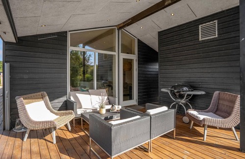 on the east side of the house is a partially covered terrace where you can enjoy your breakfast on a beautiful summer morning From the living room you have access to a covered terrace overlooking the lake, where you can enjoy the warm summer evenings. This environment can be the backdrop for many cozy barbecues with family and friends. There is a swimming pier by the lake and plenty of fine sand, so you will feel like you are on your own little beach. There is additionally a fire pit where you can hold marshmallows and stick bread over the fire in the evenings. If you like fishing, you can keep the freshly caught fish in a cleaning area.