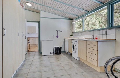 welcome to this spacious and cosy wooden holiday home, which offers plenty of space for two families The house is situated on a peaceful natural plot and has a large, open wooden terrace where you can spend many pleasant hours relaxing and socialising from early in the morning until late at night. Inside, you will find a beautiful open-plan kitchen, a large utility room and a cosy living room with a wood-burning stove. The house enjoys a wonderful location in an attractive green setting, not far from a lovely sandy beach, good cycle paths and a small swimming pool.