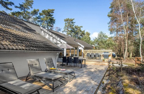 welcome to this inviting vacation home, partly located in the dunes, about 200 m from the white sandy beach of dueodde The house has 5 good bedrooms and a spacious bright living room with wood stove. Everything is decorated in light colors and modern Scandinavian style. The kitchen is modern and well equipped and invites you to cook together. The pool room offers swimming fun for the whole family. After a trip to the pool, you can enjoy a massage in the large whirlpool and the sauna offers pleasant warmth and relaxation.