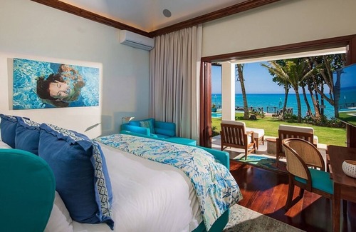 Located right on the oceanfront at the western end of the resort, Aqua Bay redefines the concept of ocean style. Reflecting the ambiance of the sea throughout, this handsome villa boasts not only a splendid infinity heated pool with spa but two swimming holes on the coastal strip fed with sea water and a white sand elevated beach. Designed to be open to attract the prevailing breezes and the stunning ocean view, the villa also has the option to be fully air-conditioned if so desired. Throughout are tantalizing views of the sea which begin at the entrance portico which is framed either side with rainwater waterfalls. Many areas of the villa have open vaulted ceilings displaying the natural colour of the cedar shingles. All about the colours, patterns and textures of the ever-changing ocean prevail. There are four bedrooms including a master bedroom suite, each with beautiful wood floors. Three bedrooms face the ocean and one the garden. The striking en-suite bathrooms have walk-in showers and tubs with three of the tubs positioned outside in the fresh sea air. The master suite has two showers, one inside and one outside. The large covered sea-facing veranda has a dining area for twelve and a comfortable sitting area for ten. There is also a cosy breakfast nook with television. A formal sitting room, games hall and bar open out onto the veranda and these rooms can all be air-conditioned if required. The sitting room is equipped with a media centre and a 75 inch television with a further 65 inch television in the bar. Also facing the ocean is a fully equipped air-conditioned gym with television and a separate massage room with two tables and en-suite bathroom. The gym has Peloton bikes just remember to bring your biking shoes! A landscaped courtyard off the gym has a table tennis table. A separate den equipped with flat screen television is a perfect place for all those who wish to escape. Directly facing the ocean is a large heated infinity swimming pool which has an exercise lap lane and there is also a spa and a sun deck within the pool. Beyond this are two swimming holes on the coastal strip fed by sea water and an elevated white sand beach with an adjacent large timber deck. Between the swimming pool and deck is a superb ocean facing fire pit. There is internet access throughout the villa together with iPad tablets, Sonos, Apple TV, Amazon Fire TV and Cable TV.