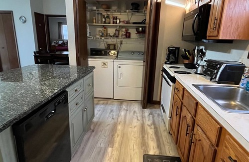 just bring the food! the kitchen is fully equipped with coffee maker, dishes, utensils, dishwasher, microwave, oven, stove, refrigerator, toaster oven, griddle, blender, a kitchen island, pantry items, and washer/dryer There is a propane heated fireplace, (Oct-May), a ceiling fan and skylight in the living room.