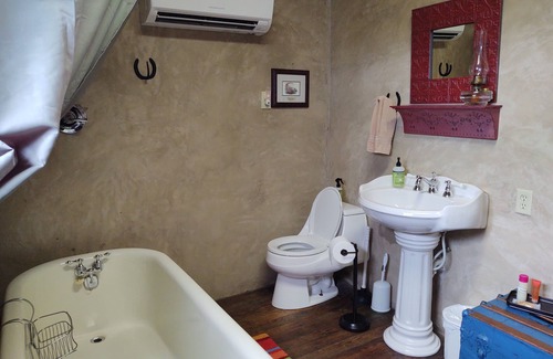 Secluded Hill Country get-away cabin on private ranch, central to LBJ State & National Parks, more than 20 Wineries, Distilleries & Breweries within 10 minutes. This cozy two room cabin features a private bathroom with Texas Sized antique bathtub / shower. Kitchenette complete with microwave, refrigerator, flatware, stemware, K-Cup brewer with an assortment of coffees teas and cocoa.