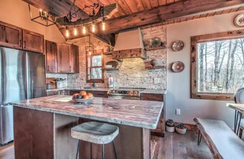 the whole house has been completely gutted and rebuilt, designed to offer the true vt experience From the inviting living area, which features a wood burning fireplace, cathedral ceilings and wall to wall windows and sliders that invite the outdoor in, to the custom made kitchen with custom made hood (reclaimed wood from an old VT barn), natural stone backsplash, high end appliances and center island. The kitchen is equipped with everything you need to cook a nice dinner or breakfast. Open space between the living room, dining room (sitting up to 8 guests and with massive windows overlooking the mountains), and kitchen. The family room, on the same level, is cozy , has a pull out queen-size couch, and Smart TV. Much thought has been put into designing the half bath on this level, with a custom-made vanity (from an antique dresser) to custom-made light fixtures and bath fixtures. The first floor welcomes you with a spacious hallway, 2 bedrooms, and a large bathroom (with tub and double vanity). As you walk up the 3rd floor, the views are getting better and better from the primary suite, which boasts wall to wall windows. This top floor bedroom leads to a cozy lofted living area (with a pull out couch) and a primary bathroom with shower and custom-made fixtures.