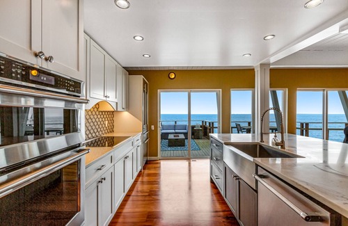 upon entry, you'll be met with a bright interior and a warm feeling of welcome throughout the space Make yourself at home in the stylish and contemporary living area by resting on the plush furniture, reading by the roaring fireplace, streaming your favorite movies, or serving up cocktails at the bar. Hobby chefs will love preparing grand meals and beach picnic snacks in the full kitchen, equipped with stainless steel appliances and a floating island breakfast bar.