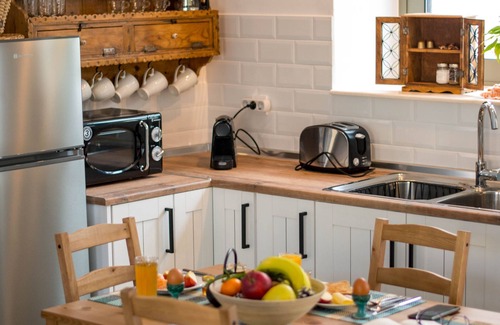 with its rustic and modern design it combines the old with the new and it is the most charming for lovers in the countryside, peace, and explorationLocated just 10 meters from the village square, from the tourist shops and taverns that serve traditional goodies at the same time has the privilege , since it has a backyard with a garden to give the guest the privacy needed with a view of the sunrise on Attaviou, the tallest mountain of the Dodecaneseon, as well as offering them sunny noon at its flowery garden.