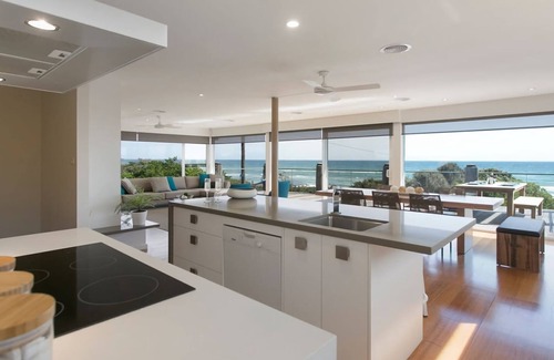 luxuriously appointed with 4 bedrooms, large open plan living spaces on both levels (downstairs has an additional queen sofa bed), internal dining for up to 10 guests and a large top deck providing al fresco dining, an open fireplace, 3 bathrooms (ensuite to master), a contemporary kitchen with the best on the beach views in town, pet-friendly* anchor beachfront retreat is the perfect holiday year round destination