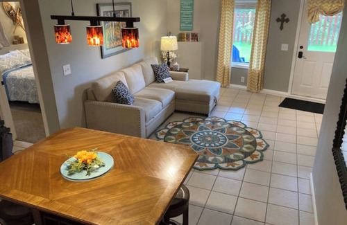 guests have a separate parking area with a side walkway into the guest suite entry Guest driveway/parking can accommodate 2 side-by-side vehicles, up to 4 vehicles or even an RV. Guests are welcome to use our fenced back yard, and we have several yard games available as well as an outdoor grill for guest use.
