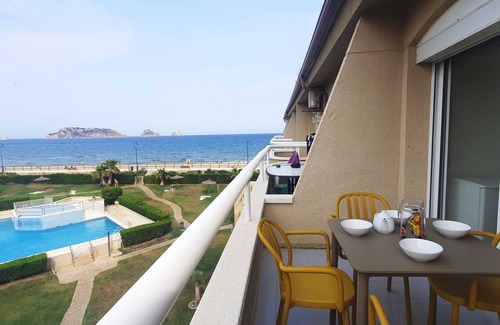 Apartment to rent in L'Estartit Costa Brava with front view to the sea.Free WifiApartment on the first line to the sea view directly at the Medes islands,the sea, the communitarian pool prepared by adults and children.It is a third floor without lift, Free Wifi, living room composed by sofa and television, kitchen with ceramic hob with two fires, microwaves, fridge, bathroom with a shower, the washing machine, toilette, sink, you enjoy the terrace with view direct of the sea, there is open room what is a open mezzanine with one double bed and two single beds.Direct acces to the walk from the communitary pool and gardens to the beach cross the ride, between of Ter Vell Natural Park,next to the zone proteged of The Pletera beach. Located in the town of L'Estartit, Costa Brava coast, the country is Spain, at 10 metres of the fine sand beach and at 1400 metres to the town center of L´Estartit. The supermarket and restaurant are at 150 metres to the apartment..
