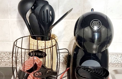 coffee machine with pods, moka pot, kettle, microwave, and cable tv