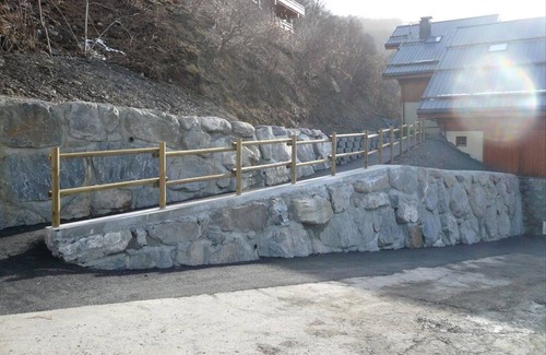 the apartment is located on the raised ground floor of a chalet with 9 apartments with a stone facing facade at the base, topped with pine siding