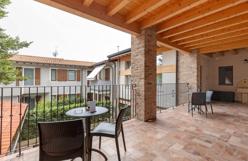 at le logge del garda, in san felice del benaco, you can make use of shared facilities such as a covered terrace, a garden, and an outdoor pool Street parking is available. Pets are allowed for an additional fee. However, events are not permitted on the property.