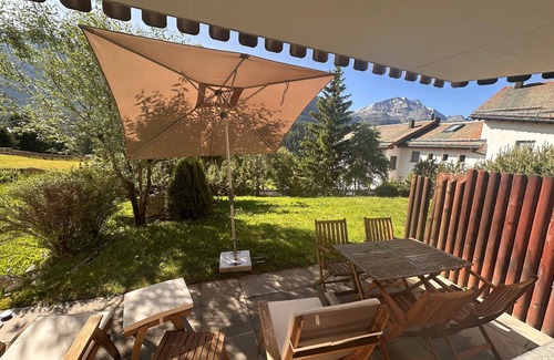 this apartment is furnished with local swiss stone pine wood furniture, providing an authentic charm The cozy and spacious living room offers plenty of space to relax. One of the standout features is the garden seating area, boasting a stunning view and complete with table, chairs, and a sunshade. The two bedrooms each have a double bed, offering pleasant comfort. The bathroom features a shower and a toilet. The kitchen is functional and fully equipped. A garage parking space, ski room, and laundry room are also available. This apartment provides everything you need for a comfortable and relaxing stay.