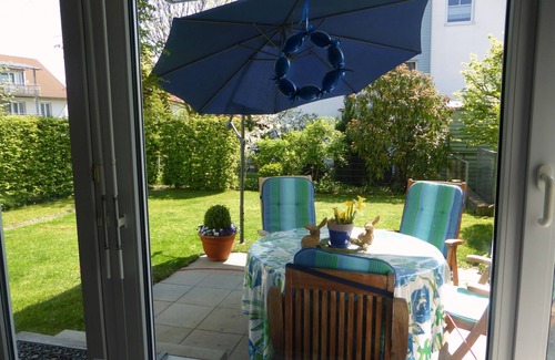 Welcome to Langenargen directly on the shores of Lake Constance. The 86sqm apartment is located in a quiet residential area, approx. 6 minutes' walk from the lakeshore, on the ground floor of a modern apartment building. A garden with a covered terrace offers plenty of space for relaxing in summer. Bicycles can be conveniently stored in the bicycle shed next to the house and a parking space belonging to the apartment is located directly in front of the residential complex.
