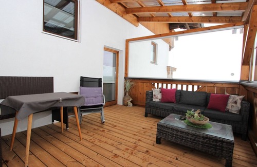 3-room apartment 55 m2 on 2nd floor Partly with sloping ceilings, cosy furnishings: entrance hall. 1 room with 1 sofabed, 1 double bed and hand-basin. Exit to the balcony. 1 double bedroom with hand-basin. Exit to the balcony. Kitchen-/living room (oven, dishwasher, 4 ceramic glass hob hotplates) with dining nook and satellite TV (flat screen), radio. Shower, sep. WC. Balcony, large terrace roofed. Terrace furniture, barbecue, deck chairs. Marvellous panoramic view of the mountains and the valley. Facilities: Internet (WiFi, free). Please note: private entrance.