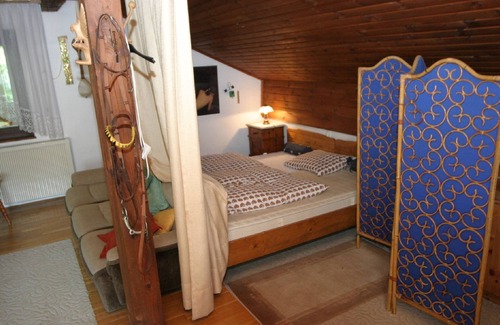 the holiday apartment is on the upper floor of the house (suitable for families with max 2 adults + 2 children or 3 adults) and is accessed via a private staircase next to the house. The holiday apartment offers a spacious living/bedroom, a small well-equipped kitchen, 2 bedrooms (one with 2 single beds), a spacious bathroom, an infrared sauna and a beautiful balcony. In the garden there is a trampoline, a pool (open from May-September and shared with other guests), garden furniture and sun loungers. You can park directly under the carport (with e-charging station) and there is also the option to rent bicycles and e-bikes (free of charge).