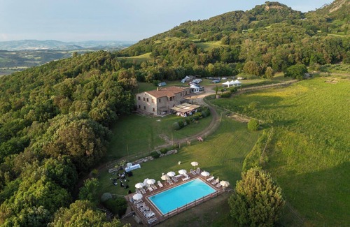 this 17th century farmhouse sits in the heart of a small valley surrounded by steep mountains, isolated from traffic noise You have views overlooking the Cecina Valley and Volterra. Take relaxing walks along tracks and pathways leading into the woods, or explore the large park with centuries old Holm oak trees and a small stream flowing through reeds.