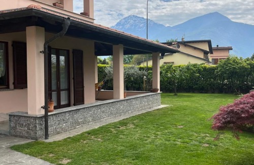 step outside to your private garden with grill and covered terrace furnished with sofas, table, and chairs, ideal for outdoor dining and relaxation The apartment sits just 20 meters from the lake and Dongo's lido, offering a beach, beach volleyball courts, soccer tennis, and children's play areas. A 10-minute lakeside walk takes you to the public beach Le Gere for peaceful moments by the water.