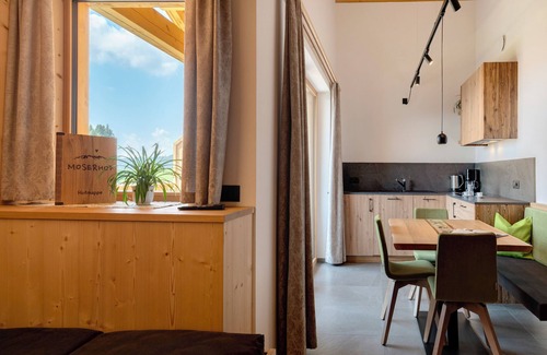 The holiday apartment Moserhof Wohnung Salbei, which is situated in Flaas, overlooks the Dolomites. The 43 m² property consists of a living room with a sofa bed for 2 people, a well-equipped kitchen, 1 bedroom and 1 bathroom and can therefore accommodate 4 people. Additional amenities include high-speed Wi-Fi (suitable for video calls) as well as children's books and toys. A baby cot and a high chair are also available.