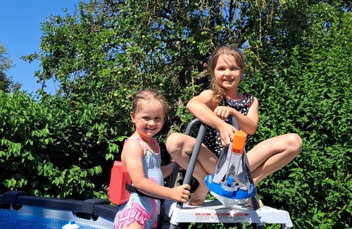 Appartement (52qm) im 1. Stock für 4 Personen in ruhiger Randlage. Man hat einen schönen Blick auf Wiesen und Felder. Die Wohnung verfügt über ein Schlafzimmer mit einem Doppelbett und ein Schlafzimmer mit zwei Einzelbetten. Die separate Küche ist voll ausgestattet mit einem Essplatz, Backofen, Geschirrspüler, Wasserkocher, Kaffeemaschine, Schneidemaschine, Kühlschrank, Mikrowelle und Toaster. Im Wohnbereich befindet sich eine Couch- und Sesselgarnitur, eine Stereoanlage mit CD- Player und Radio und einen Kabel- TV mit Flachbildschirm. Das Bad besteht aus Dusche und WC und verfügt über einen Fön. Die Wohnung hat einen Balkon (Zugang vom Wohnbereich aus), einen parkähnlichen Garten mit großer Liegewiese, sowie einen Pavillon mit Grillplatz und einen Spielplatz. Für kleine Kinder sind verschiedene Tiere (wie Katzen, Ziegen, Ponys) am Grundstück vorhanden und Fahrräder und Bobby- Cars sind kostenlos verfügbar. Handtücher, Bettwäsche und WLAN- Nutzung sind im Preis enthalten..
