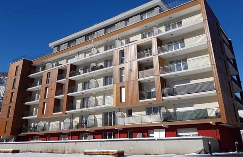 In the center of Briançon an appartement for 4 people with closed underground garage and a cellar. Located on the 5th floor of a new résidence a T2 of 36m2.