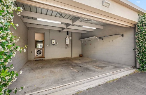 once through the gate, you’ll find a quiet oasis with an attractive, low maintenance garden, outdoor seating and a barbecue Let yourselves in, grab the garage door remote and take your car theogony the secure gate and into the double garage at the rear of the townhouse. Parking for 2 cars.