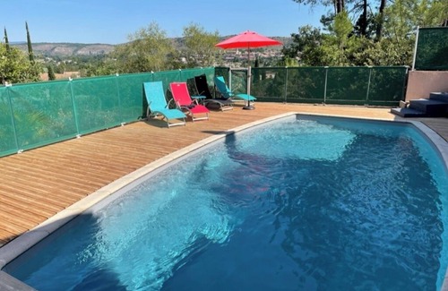 Near the Ardèche gorges, house completely renovated in the shade of pine trees including private pool with protective barriers, three bedrooms, two with double beds and one with two bunk beds, large living room, equipped kitchen, large terrace with Plancha offering a splendid view of the medieval village of Joyeuse.