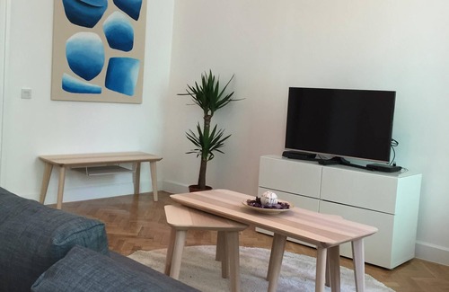 This elegant, luxury apartment is located in the heart of the Budapest overlooking the famous pedestrian thoroughfares Váci street. One-bedroom apartment for 2 to 4 people with king size bed and bright living room in-between. Sofa in the living room can be turned into a specious bed. Pastel and warm colours of the furniture, help you to feel relaxed. In the bedroom there is an open bathroom that includes shower, sink, towels and toiletries. The lavatory room is next to the entrance. The apartment has fully equipped kitchen with oven, stove, dishwasher, toaster, kettle, coffee maker and a table. It has been completely renovated in 2017..