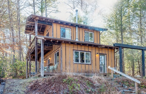 immerse yourself in the enchanting treetop charm of our stylish cabin, nestled high above the ivy river Unwind in this lovingly crafted retreat, adorned with wood milled on-site. Relax on two private decks with winter vista views and summer Appalachian flora and fauna. Cozy up by the working wood stove or indulge in a soothing jetted bath. only 5 minutes from downtown marshall, 20 minutes to asheville, our cabin is the ideal respite for those seeking an escape from busy city lives!