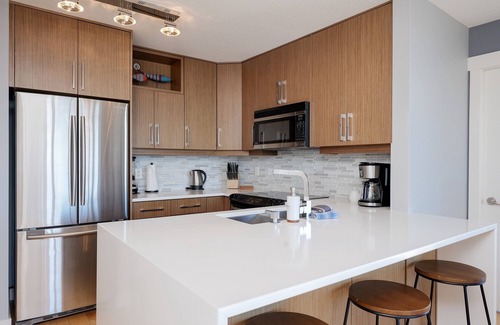 the condo is newly outfitted with modern, comfortable furnishings There are two Smart TVs in the suite, one in the living room and one in the main bedroom. Each are Netflix accessible with your own login. The main bedroom has a much sought after King bed and the second bedroom has a Queen. The kitchen is complete with a full-size fridge and all the supplies needed to cook a gourmet meal. Enjoy your morning coffee or cook your locally purchased steak and seafood on the electric BBQ on the NE facing balcony. Also included are wireless internet and in suite washer and dryer. The suite is stocked with a start up supply of everything you need to enjoy your stay, from bathroom amenities to laundry soap. For those staying with us for a longer period of time you will likely need to replenish what you require. This suite has available a portable 1400 BTU air conditioning unit, to help with our high temperature days.