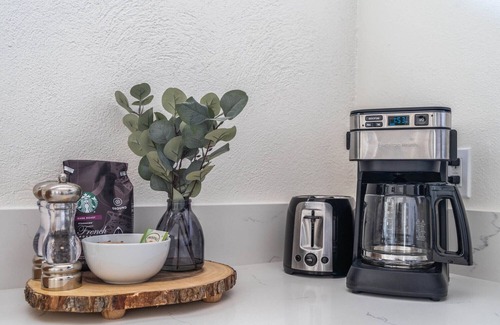 our home features an open concept space with a cozy futon suitable for one additional guest, a smart tv with roku, hi speed wifi, a 4-person dining table, and a kitchen equipped with dishware, cookware, microwave, toaster, and coffee pot New wood-look flooring throughout the home, freshly painted, quartz countertops, large farm sink in a kitchen fully loaded with stainless steel appliances. You can choose from two similarly sized bedrooms with comfy queen beds, each adjacent to it’s own bathroom stocked with towels, shampoo, conditioner, and body wash.