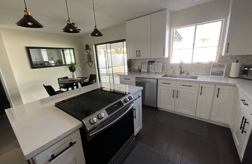 the home is named for the impressive beauty of the interior/exterior renovation completed in early 2023 Its tranquil backyard has custom fire features to keep you warm with plenty of seating for rest and relaxation while enjoying the stunning views of the Superstition Mountains and the amazing colors of the beautiful Arizona sunset. Nestled in a quiet neighborhood near Mesas best shopping, dining, and outdoor attractions, “Superstition Mountain Majestic Getaway” is the perfect home base for your adventure..