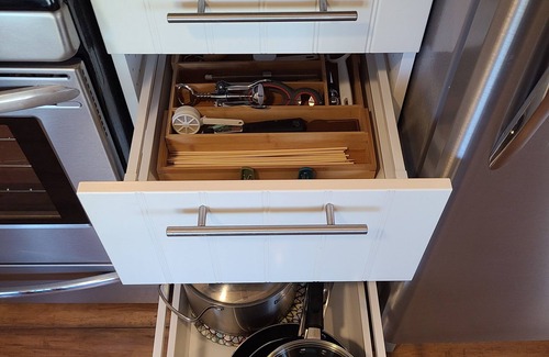 Enjoy great mountain views off the front porch and nighttime city views from the back balcony of this cozy attached guest house. The guest house offers an outside dining area, two designated parking spaces, with extra RV parking available. Inside, the bedroom has a comfortable Queen-sized bed, and the living room has a sleeper sofa, 2 comfortable chairs and a 60" smart TV. The kitchen is very well equipped with modern appliances, including a microwave, gas range, coffee maker and rice cooker. There is no dishwasher, so guests are asked to wash their own dishes. Paper plates, bowls and plastic utensils are also provided..