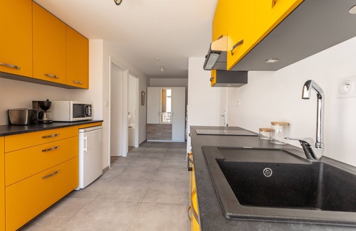 - a kitchen opening onto the living room, equipped with: electric kettle, oven, microwave oven, toaster, dishwasher, hotplates..