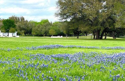 outdoors, you're welcome to explore ten private acres of texas countryside with majestic sprawling oak, elm and cedar trees where deer wander freely and birds love to nest Dine or relax on the broad, flagstone patio. When weather permits, we often build a bonfire (by request) in the huge stone firepit for our guests during fall and winter.