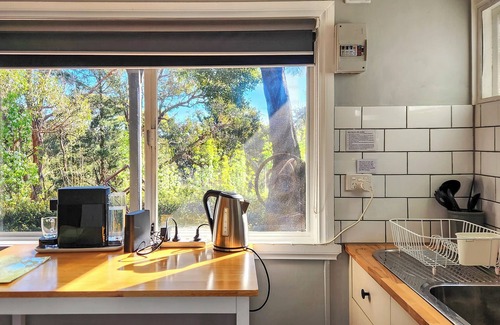 Aurora is a studio cottage with a private landscaped garden and gorgeous views over the surrounding forest. Situated in the most desirable part of Hepburn Springs at the high end of a lightly forested long and sloping 1-acre site (with two other small cottages on it) that adjoins and has direct access to the Hepburn Mineral Springs Reserve, the cottage provides a relaxed and peaceful getaway. The compact kitchenette contains all the essentials if you want to prepare your own meals, but the Daylesford/Hepburn Springs area has a well-deserved reputation for outstanding cafes and restaurants.