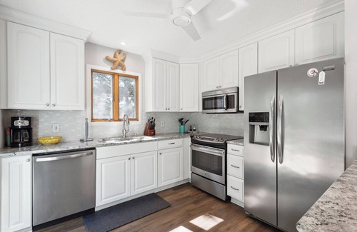 after a day at the beach or exploring town, come home and relax in the open-concept living area with vaulted ceilings and skylights that create a bright and airy vibe with abundant natural light This fabulous combination living/dining space leads out to an expansive wrap-around deck where you lounge in the sun for your daily dose of Vitamin D. Back inside, get dinner started in the brand new kitchen with stainless steel appliances and granite countertops. Gorgeous LVP flooring flows throughout the entire home, including the bedrooms. The main level queen suite features an updated semi-private bath, and two more bedrooms upstairs share a Jack-and-Jill bath. Outside, you'll find a thoughtfully landscaped yard with charming walking path to a raised deck with seating for relaxing under the mature oak trees.