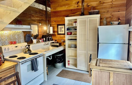 recently restored, this space is bright, open and totally comfortable The kitchen has an old cast iron sink and a full working kitchen, along with antiques and art from the farm. You can cook up a delicious dinner with some fresh lobsters in the kitchen and dining area downstairs. And upstairs you’ll find a comfy queen-sized bed with cozy, seasonal comforters, full bath, and living area. The skylight lets in both the stars and the morning sun and there are many places to relax—inside and out. Enjoy your morning coffee or evening glass of wine at the outdoor table with chairs and grille.