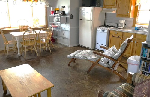 there is a full kitchen with everything you would need Two TV's, ironing board and iron, hair dryer, heater, window fans, no AC, picnic table w/umbrella, lawn chairs, charcoal grill, and a safe off the street parking lot. Cottage has a reading library and board games. You have a clothes line behind your cottage. Parking is limited to TWO vehicles. No boats, trailers or campers.