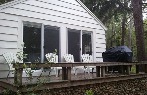 vacation with friends or extended family in this 'old cape cod' style setting with a large private beach on john joseph’s pond This 3.5 acre private wooded lot has 3 cozy cottages each with its own fireplace and 2 separate kitchens so that you and your friends or family can vacation together but still have privacy when you want it. A covered breezeway connects 2 cottages and a common courtyard allows for the whole group to gather around one or both of the two fire pits. Or follow a short wooded path down to a large private sandy beach for lounging or for swimming off the dock or to the float. Enjoy boating ( several boats available for your use), fishing, or just relaxing during the day. In the evenings enjoy food or song at the fire pits on the beach. And don't forget your dogs or other furry friends!.