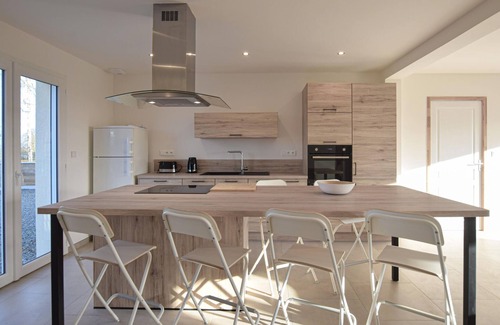 in this ground-floor holiday home, bright rooms, clear lines and natural materials create a relaxed atmosphere in which you can spend harmonious days with your family Prepare your meals in the spacious kitchen and take a seat in the light-flooded, open-plan living room. Make yourself comfortable on the sofa, organise cosy games evenings or treat yourself to quiet hours in the reading area.