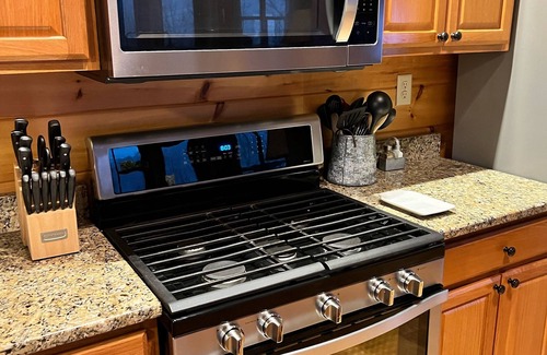 custom kitchen with granite counter tops Stainless steel appliances, gas stove/oven, microwave, and dishwasher. The kitchen has everything you will need to cook (pots, pans, Crockpot, waffle maker, utensils, plates, bowls, silverware, etc.) meals during your stay.
