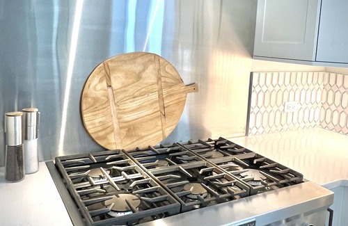 the fully renovated kitchen provides the perfect space for entertaining and cooking There are Kitchen Aid stainless steel appliances including a dishwasher, double wall ovens and a six burner gas cooktop as well as a large kitchen sink (with disposal), a prep sink (with disposal), a fully stocked kitchen and ample room for storage. The kitchen island is a feature of the home and can comfortably seat six. The three pendants above the island are historic to the church and classically repurposed.