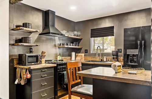 framed by gorgeous vaulted ceilings and windows, the living room is the perfect spot to spend leisure time Guests will love the large sectional couch, wood burning fireplace, smart tv, and huge selection of board games. The fully equipped kitchen may be one of the most beautiful rooms in the house with its modern design and chic appliances. Also incredibly functional, the kitchen has all the cookware and tools you’ll need for convenient cooking at home. Enjoy causal bites at the kitchen island with barstool seating, while formal meals can be hosted at the dining table set for 4.