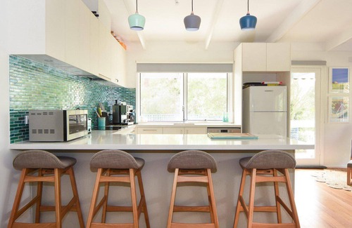 a bright, modern family beach house with an open floor plan This home is set on a lovely established garden block, perfect for entertaining outside and even a cubby tree-house for the kids to enjoy! The beach is just a short walk along a quiet bushy street.