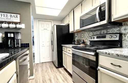 large dining area with a view to accommodate the whole family and or dinner guests On nice days, have dinner out on the deck while enjoying the sunset or have a picnic out on the beach! Galley style kitchen with brand new stainless steel appliances and granite (and tiled) countertops with a deep cast iron sink. There is a pantry for your groceries—look out for the cord pull light switch inside the pantry.