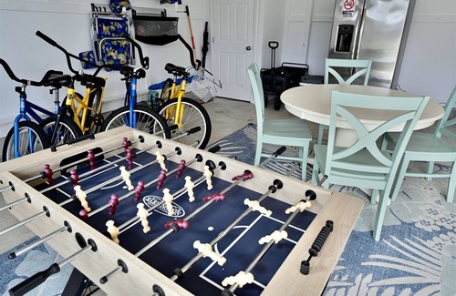 *entertainment haven: the converted garage serves a game room with foosball, ms Pac-Man arcade, and cornhole for our guests. This area makes for a great family hangout spot with its extra refrigerator and table and chairs.