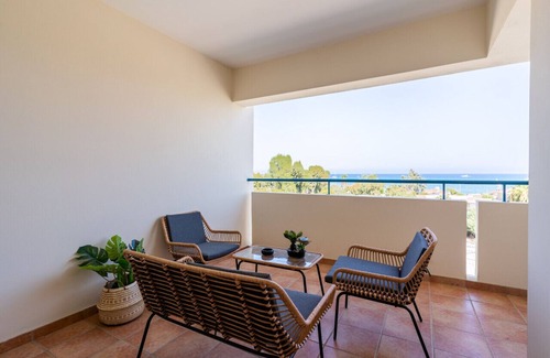 reaching the terrace, it offers a stylish and comfortable outdoor space with stunning sea views Featuring modern wicker furniture and minimalist décor, it's perfect for relaxing in the refreshing breeze, whether enjoying morning coffee or unwinding at sunset. With a seamless flow from the living room, it's an ideal spot for casual meals or peaceful reflection, embracing the serene coastal atmosphere.