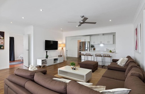this spacious four-bedroom holiday rental comfortably sleeps up to 17 guests, making it perfect for large families or groups The home features a modern kitchen with microwave, washing machine, air-conditioning, widescreen TV, video and CD player, elegant dining area, and a luxurious lounge room for relaxing together.