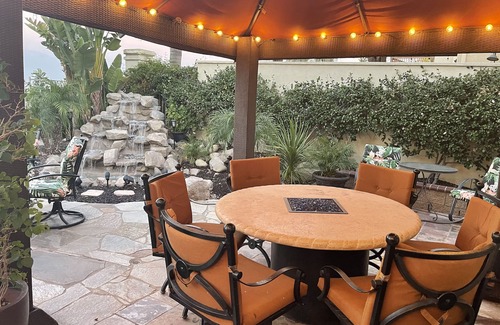 the backyard features a 6-8 person spa, super propane fire grill, rock waterfall, a fire pit area, and a comfortable patio Lots of seating. There is also a lovely front courtyard which is great for sitting and having a quiet, private drink in the afternoon, or early morning coffee.